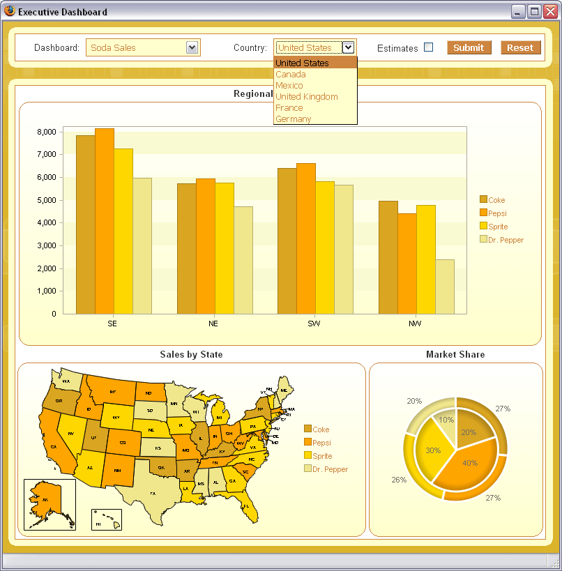 Long Description (76 Words) - Chart FX for Java is a Java component to produce charts in PNG, JPEG, SVG and FLASH formats. It supports J2EE 1.3 and 1.4, and J2SE 1.5. Chart FX for Java is available as a Server-side Bean and a JavaServer Faces component that runs on most popular Java Application Servers. It includes a free Designer, Netbeans and Eclipse Plug-ins, a Resource Center with the Programmers Guide, the Javadoc API and hundreds of samples, and the Chart FX Maps extension: a full library of dynamic maps to display any type of data graphically through your own custom maps.